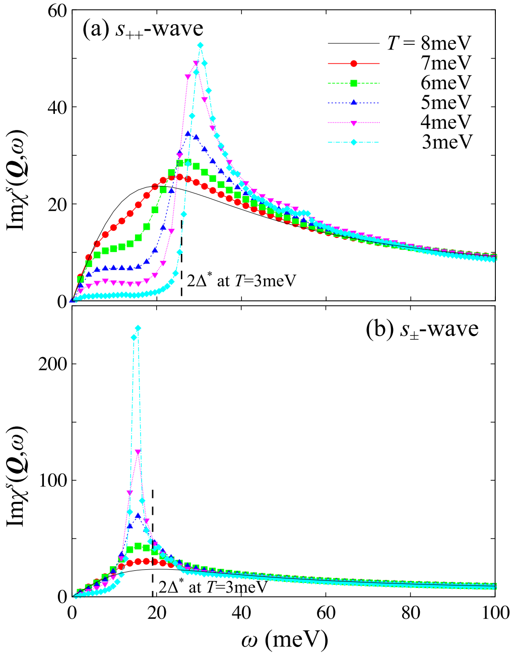 To elucidate the pairing states in Fe-based superconductors, we perform a careful calculation of the dynamical spin susceptibility χS(q,ω) at very low temperatures (T≳1meV). The feedback effect on both the self-energy and χS(q,ω) from the superconducting gap is self-consistently analyzed based on the fluctuation-exchange (FLEX) approximation. In the s±-wave state, which has sign reversal in the gap function, χS(q,ω) at the nesting momentum q=Q shows a resonance peak even when the system is away from the magnetic quantum critical point (QCP). In the s++-wave state that has no sign reversal, χS(q,ω) shows a large hump structure when the system is close to the magnetic QCP. This result confirms the validity of a self-energy driven resonancelike peak in the s++-wave state proposed in our previous semimicroscopic study: The enhancement in χS(q,ω) due to the self-energy effect exceeds the suppression due to the coherence factor effect near the magnetic QCP. We stress that the hump structure in the s++-wave state given by the FLEX method smoothly changes to a resonancelike sharp peak structure as the system approaches the magnetic QCP, which was not reported in our previous studies. The obtained ω and T dependence of χS(q,ω) in the s++-wave states resembles the resonancelike feature in inelastic neutron scattering spectra recently observed in Na(Fe,Co)As and FeSe.